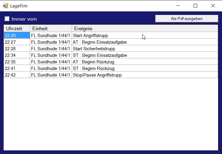 Zur Etablierung einer dezentralen Atemschutzüberwachung wird zusätzlich halbautomatisch ein Lagefilm Atemschutz erstellt, welcher dem Führunsgehilfen des EL die Protokollierung nach FwDV 7 zur Verfügung stellt, die zeitliche Kontrolle kann aber beim verantwortlichen Einheitsführer verbleiben.