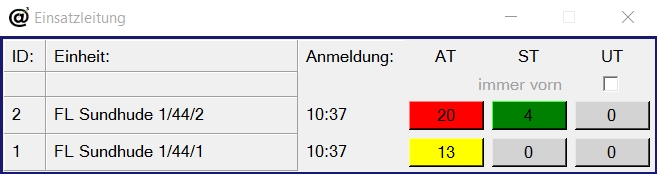 Das Modul Einsatzleitung stellt übersichtlich alle angemeldeteten Atemschutztimer auf dem Rechner des ELW dar. Der Einsatzleiter hat sofort Einsicht auf alle relevanten Einsatzdaten jeder Einheit und kann seine Lage und Nachforderung sofort einschätzen.